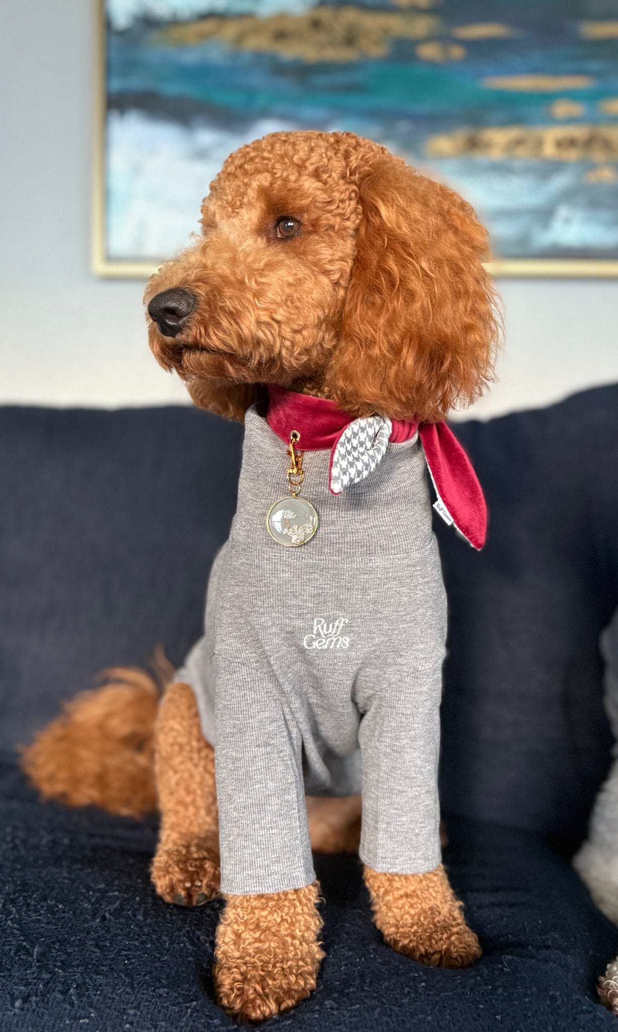 Our *Newest* color! Introducing our fan fave t in Fog. the perfect grey hue in the same comfy silky/stretchy feel, the the ultimate wardrobe staple for your furry friends! This versatile piece is designed to be worn in any season, making it a fantastic choice for all year round. You'll love our signature logo embroidered on the chest of the shirt, elevating the look, and letting everyone know what a Ruff Gem you are!