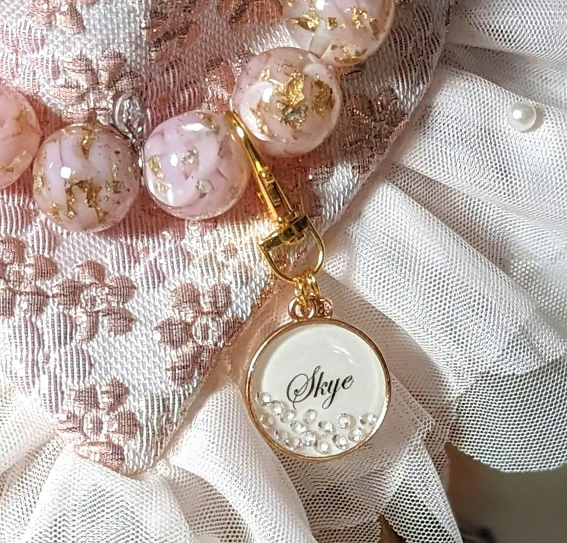 Beautiful clear jewelry grade cubic zirconia stones are set in a whimsical cascade design. Each stone is carefully placed to create a unique and one of a kind piece. -Jewelry-grade 3-4 mm Cubic Zirconia are used to create this tag. The stones sparkle brilliantly and speak volumes in person. Font is Edwardian Script (pictured).